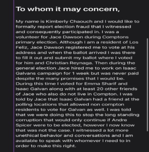 But the election wasn’t valid. Days after the election it was reported that the corruption had been witnessed firsthand. Kimberly Chaouch, who was also eventually charged with Conspiracy to Commit Election Fraud, formally recorded the disturbing details about how she was instructed to vote for Isaac Galvan and Emma Sharif, even though she didn’t live in Compton.